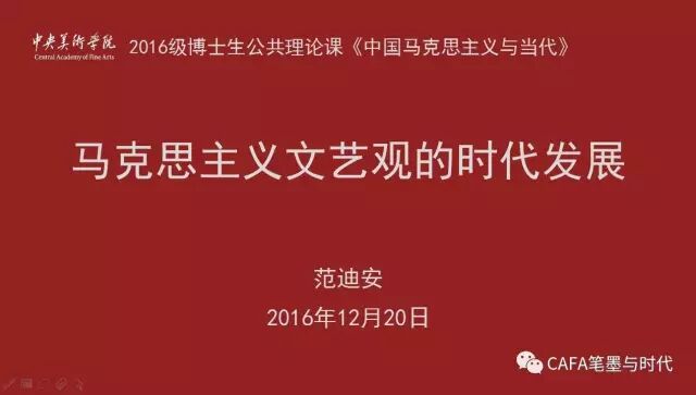 2016年12月20日下午,范迪安院长为2016级博士生思政课“马克思主义与当代”做了题为《马克思主义文艺观的时代发展》的课程讲座,这是继第一讲《马克思主义文艺史观的当代价值》之后,范院长再次为同学们带来的一场有关马克思主义文艺理论与当代中国文艺发展的思想盛宴。